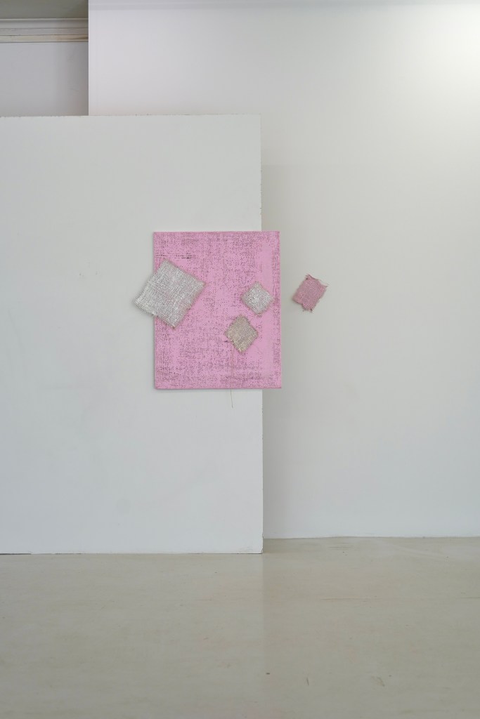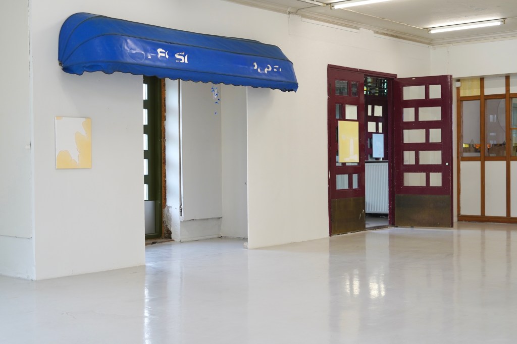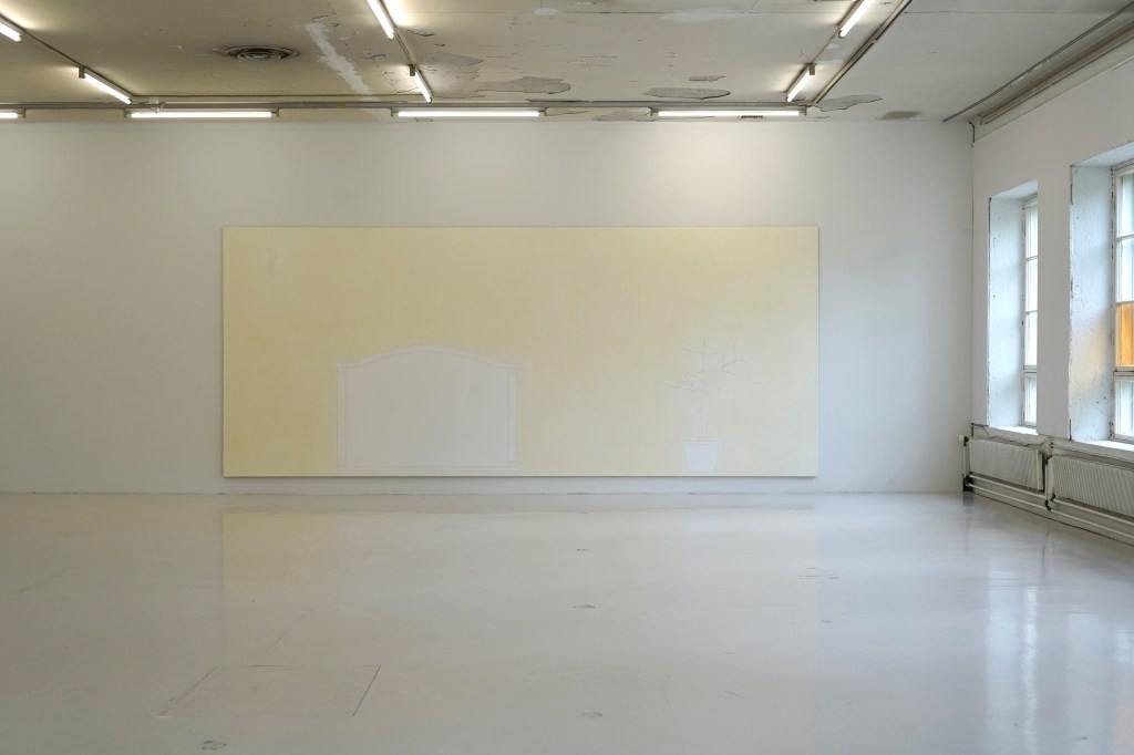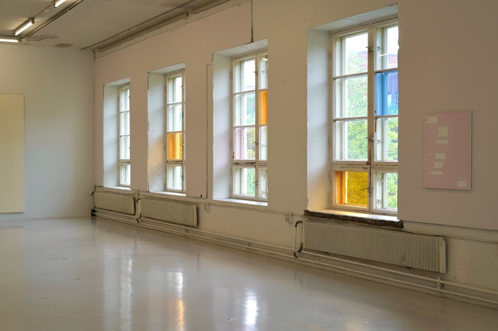 Näyttelyn onnistunut dramaturginen tilanne perustuu dialogiin tilallisen jännittyneisyyden ja eräänlaisen sattumanvaraisesti ylitsevuotavan kielellisen karakterisoinnin välillä. Jälkimmäisellä tarkoitan tässä yhteydessä sitä kielioppia, jota teokset noudattavat: ymmärrän lopulta katsovani maalausta, mutta jokaisen teoksen kohdalla olen yhä uudelleen epävarma siitä, perustuuko teosten maalauksellisuus muotoon vai käsitteeseen. Tässä mielessä (ainakin maalauksia tarkemmin muistuttavat) teokset ironisoivat paitsi maalauspinnan modernistista perinnettä, myös ajatusta niin kutsutusta maalauksen laajentuneesta kentästä sui generis. Kritiikkiä alleviivaa edelleen näyttelyssä esillä olevat katsomista karrikoivat peilit. Näyttelytilan muutamat värikkäiksi vaihdetut ikkunalasipaneelit ja niille vastakkaiseksi asetellut kaksi – (2023-2024) –nimeä kantavaa maalausta muistuttavat katsomisista ja näkyväksi tekemisen epäpaikoista.