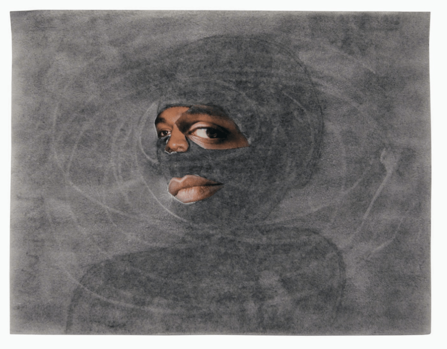 Teoksen hahmo verhoutuu pimeään, ja nojaavan kehon ääriviivat kannattelevat eriparisia kasvonpiirteitä, joiden katse on hajanainen. Leikatut ja liimatut kasvot ovat lihalliset verrattuna kehoon, joka on kuin tuhkaan piirtyvä haamu tai varjo. Varjoa ympäröivät haaleat, grafiittiin pyyhityt kehät.