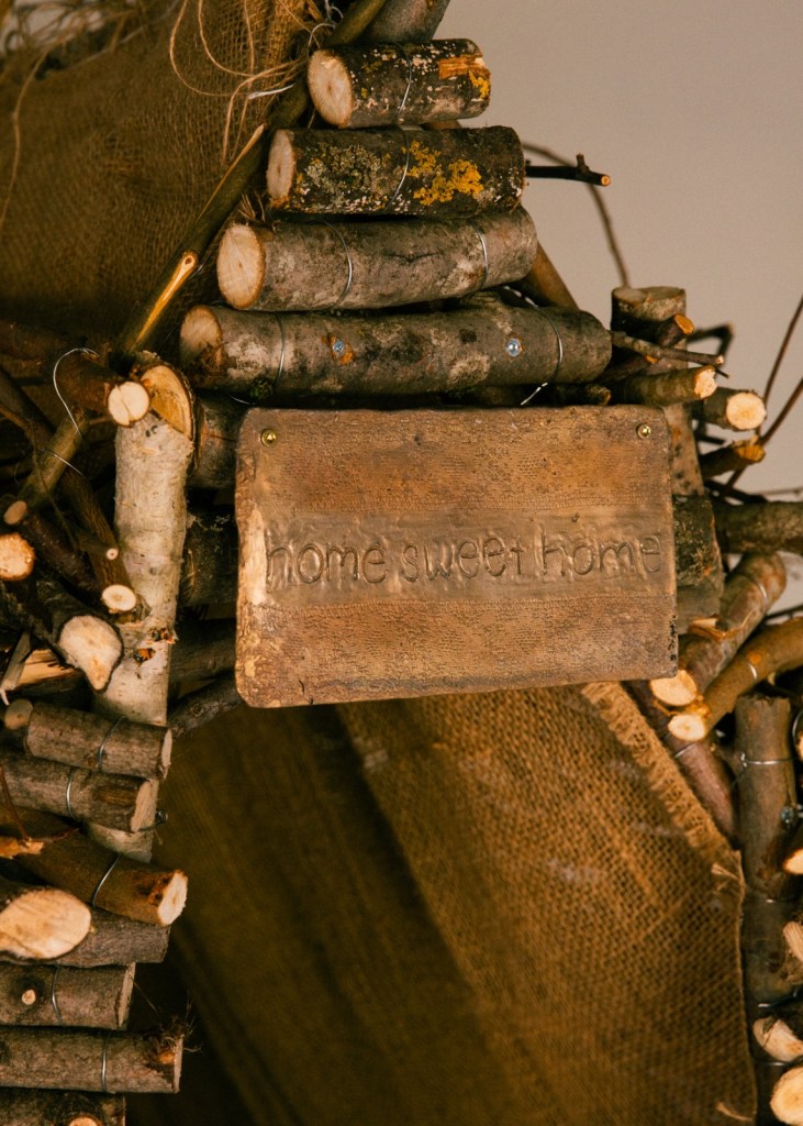 Keskimmäisessä huoneessa on risumaja. Se on majoista matalin ja sen sisäänkäynti on vielä olkimajaakin hankalampi. Onnea tuova symboliikka toistuu yhdistettynä sisustustauluista tuttuun, hieman vieraannuttavalta tuntuvaan hokemaan Home sweet home, joka koristaa pronssista kylttiä oven suulla. Kyltin myötä majan merkitys laajenee ja herää kysymys majan suhteesta kotiin. Sisältä löydän pieniä vihkosia, Elmeri Terhon runozinejä. Mistä ihminen tietää minne se on menossa? –zine alkaa kuvitelmasta kaksiosta, joka sijaitsee vieraassa kaupungissa. Runossa liikutaan vieraalta tuntuvassa asunnossa, työmatkalla, A4-paperin pinnalla, vuorella, vuodenajoissa ja merenpohjassa. Kertojan kokemus ajasta ja minuudesta kiinnittyy tilaan.